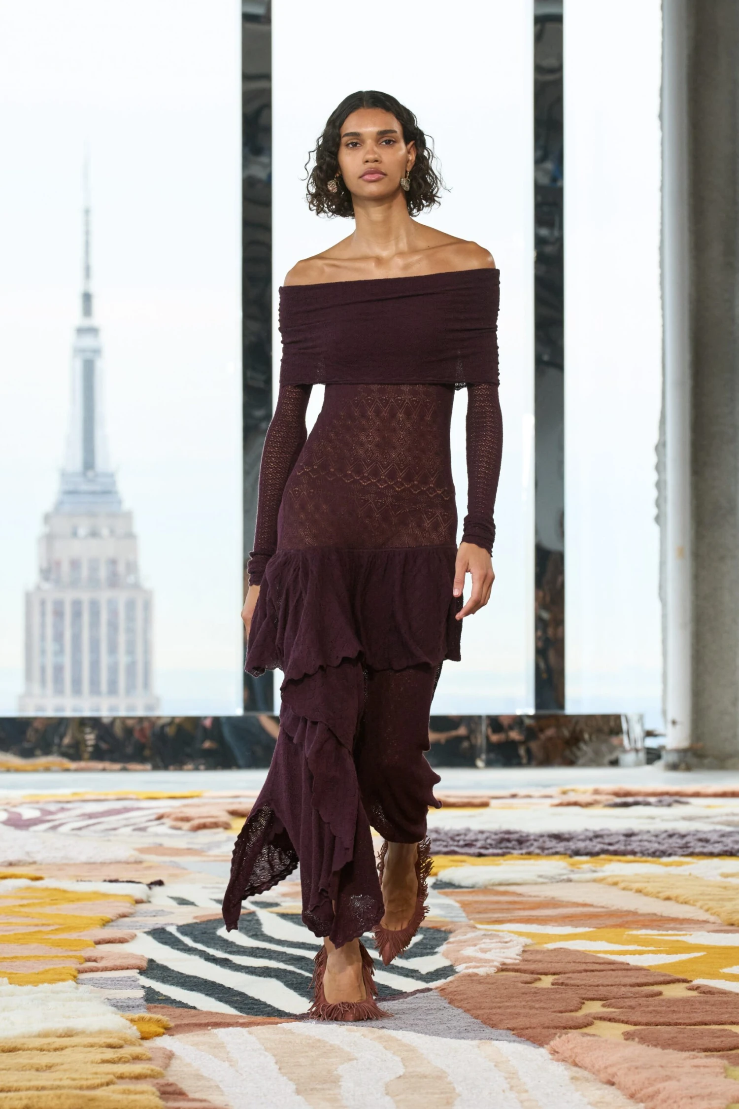 As featured in Look 7 of our Autumn/Winter ’23 Runway Show, the Ambrosia Dress is made from dark red ultrafine merino wool that’s been knitted in delicate open pointelle switches. Off the shoulder and close to the body, this gossamer knit is both alluring and refined, finished with signature ruffles falling asymmetrically across the skirt.