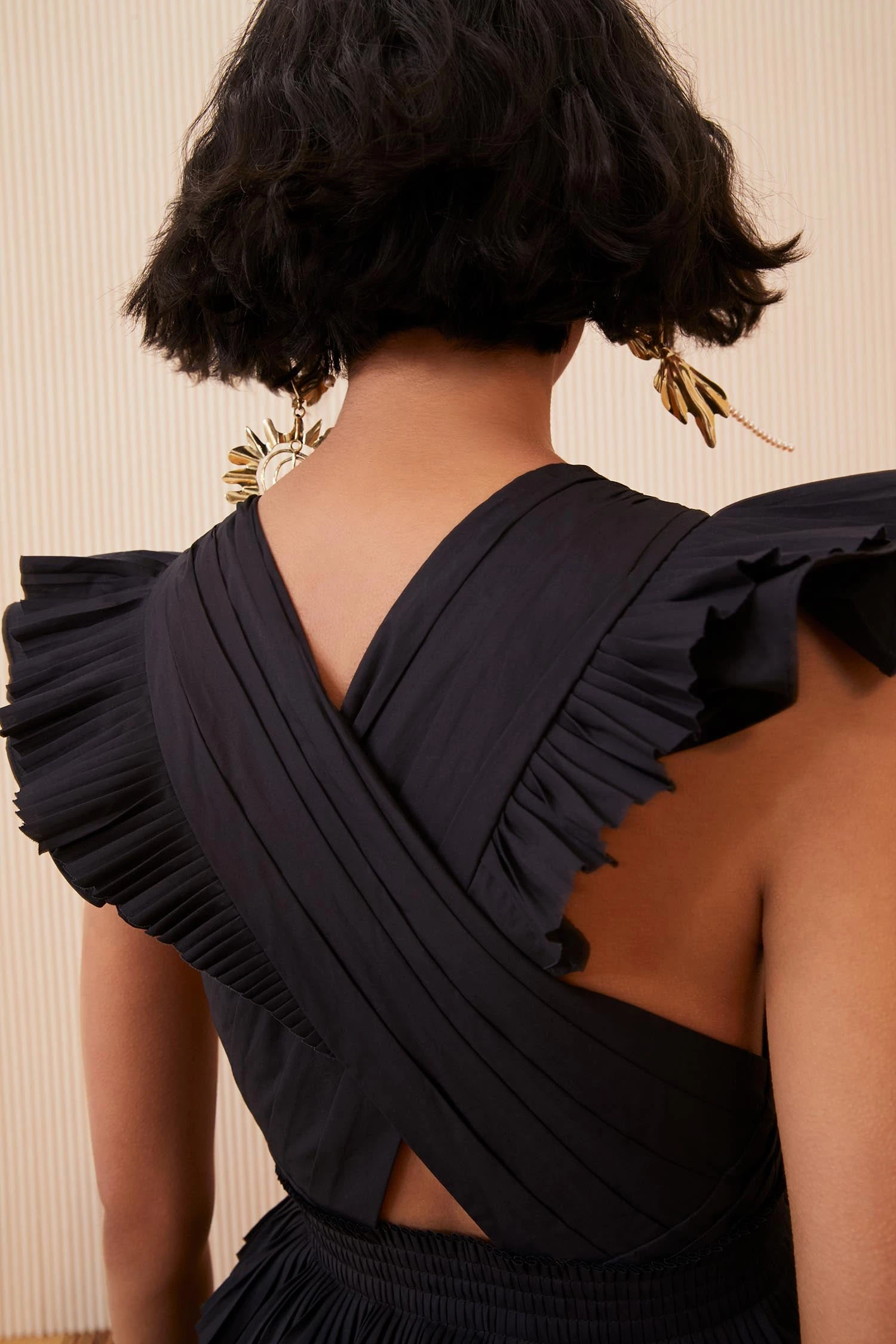 The Aurore Dress returns as an Ulla Johnson favorite, cut in crisp black poplin. This maximalist midi features layered cascading and pleated ruffles, exquisite crisscrossing neckline, and fixed waist. Wear this show-stopper with a heel or flat sandal throughout the warmer months.