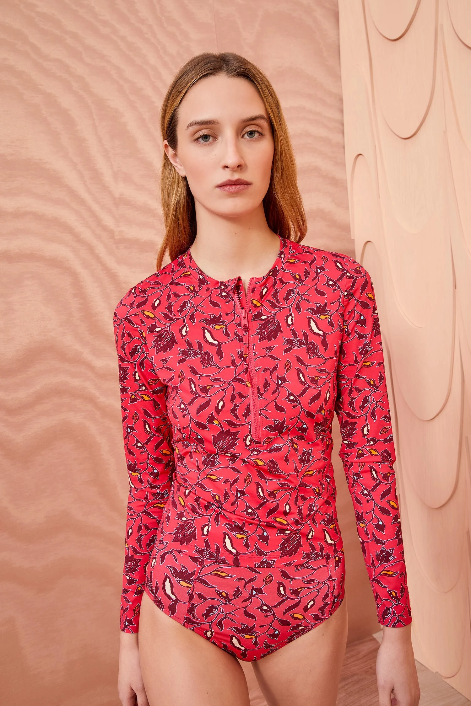 An Ulla Johnson exclusive only available in our stores or on our website, the Dione Rash Guard is crafted from comfortable, stretchy nylon that boasts a floral dark pink geometric print. This long-sleeved, full-coverage swim silhouette is a pull-over style and features a classic round collar. This showstopping gown is an Ulla Johnson exclusive and is only available in our stores or on our website.