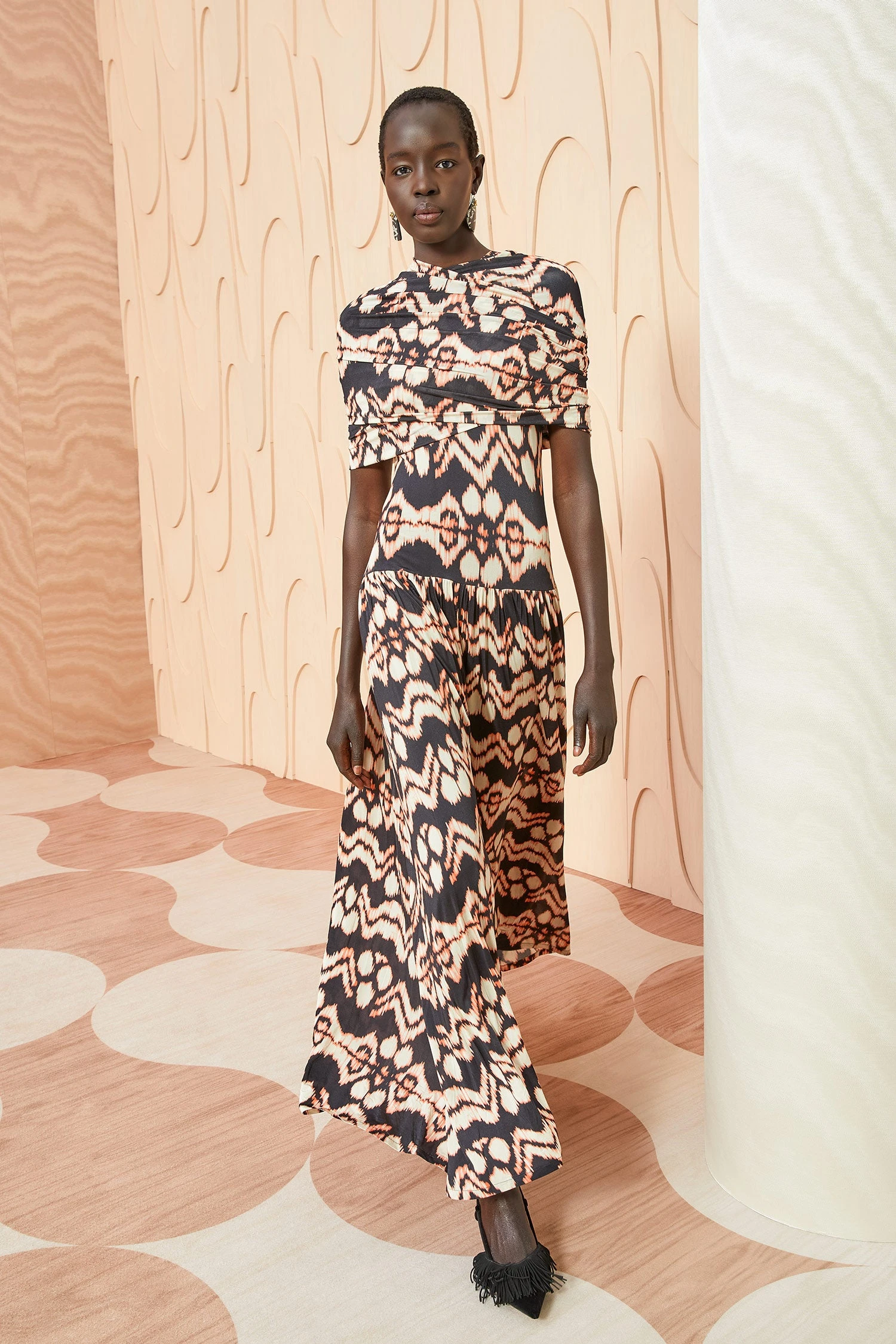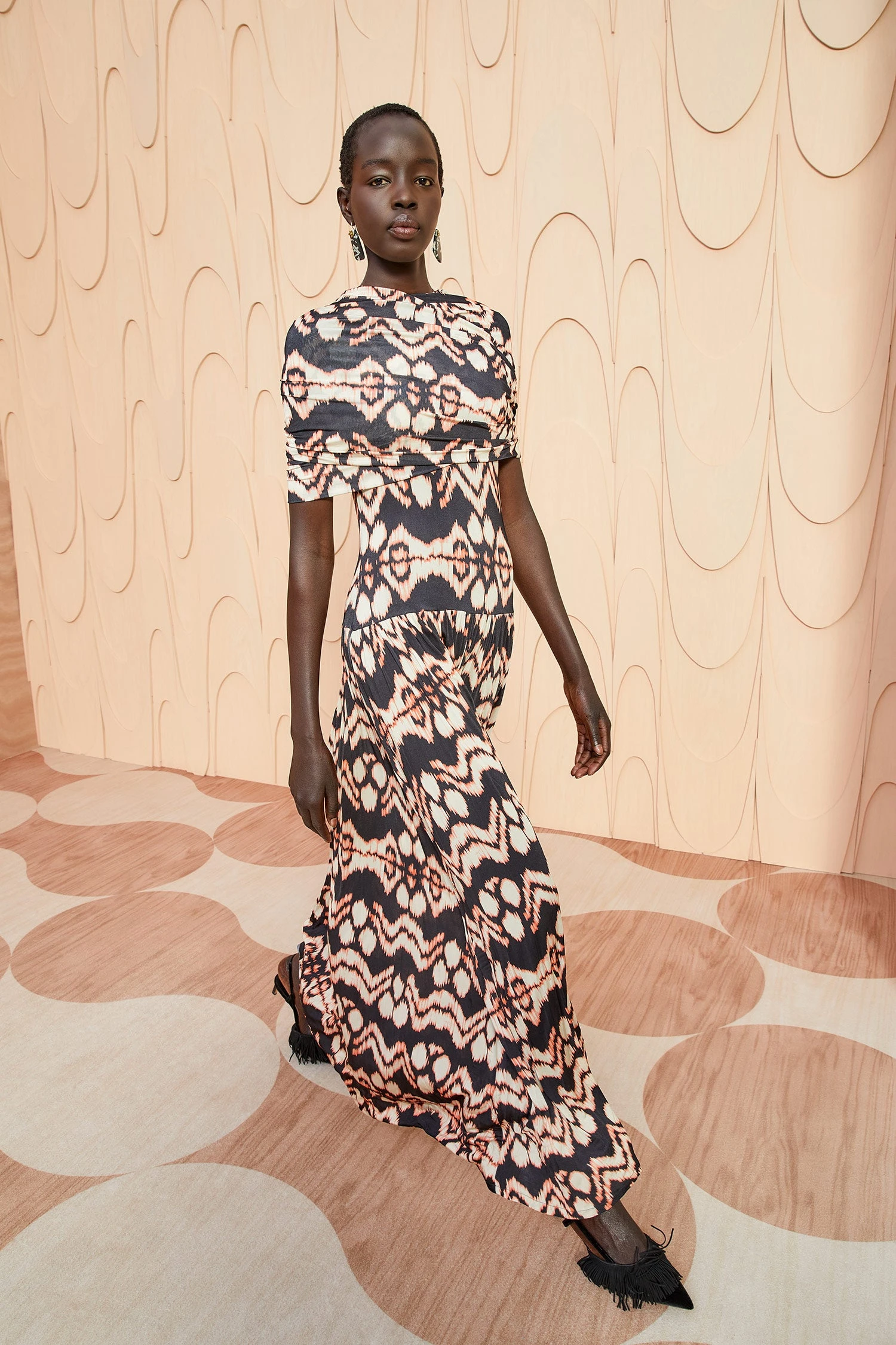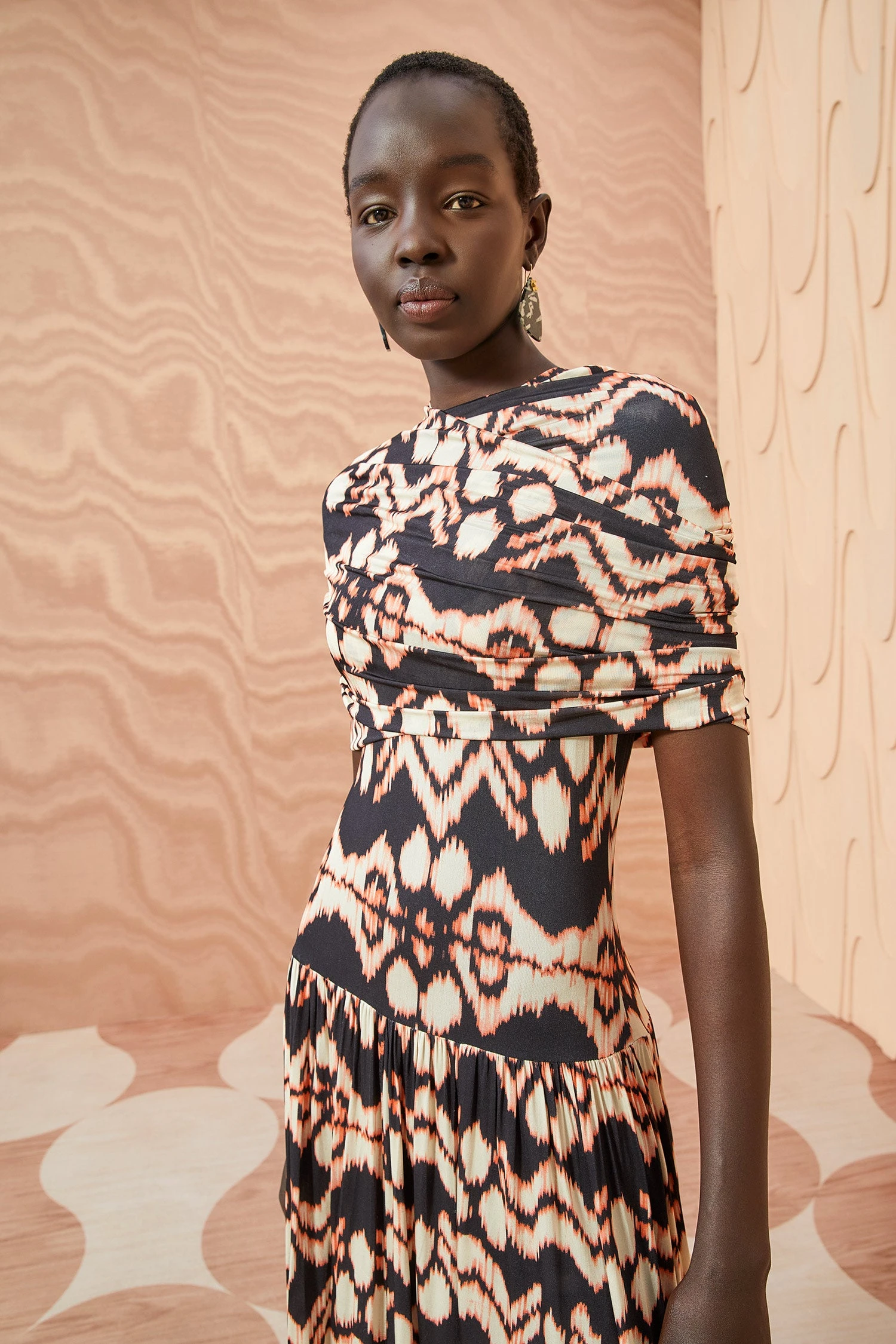 As featured in Look 43 of our Autumn/Winter ’23 Runway Show, the Livia Dress is cut from our silken draped tricot jersey in a graphic ikat-inspired cream and black pattern. The bodice is inspired by grecian sculptures, made with an exaggerated ruched overlay which comes down each arm. It is finished with a gathered maxi-length skirt.