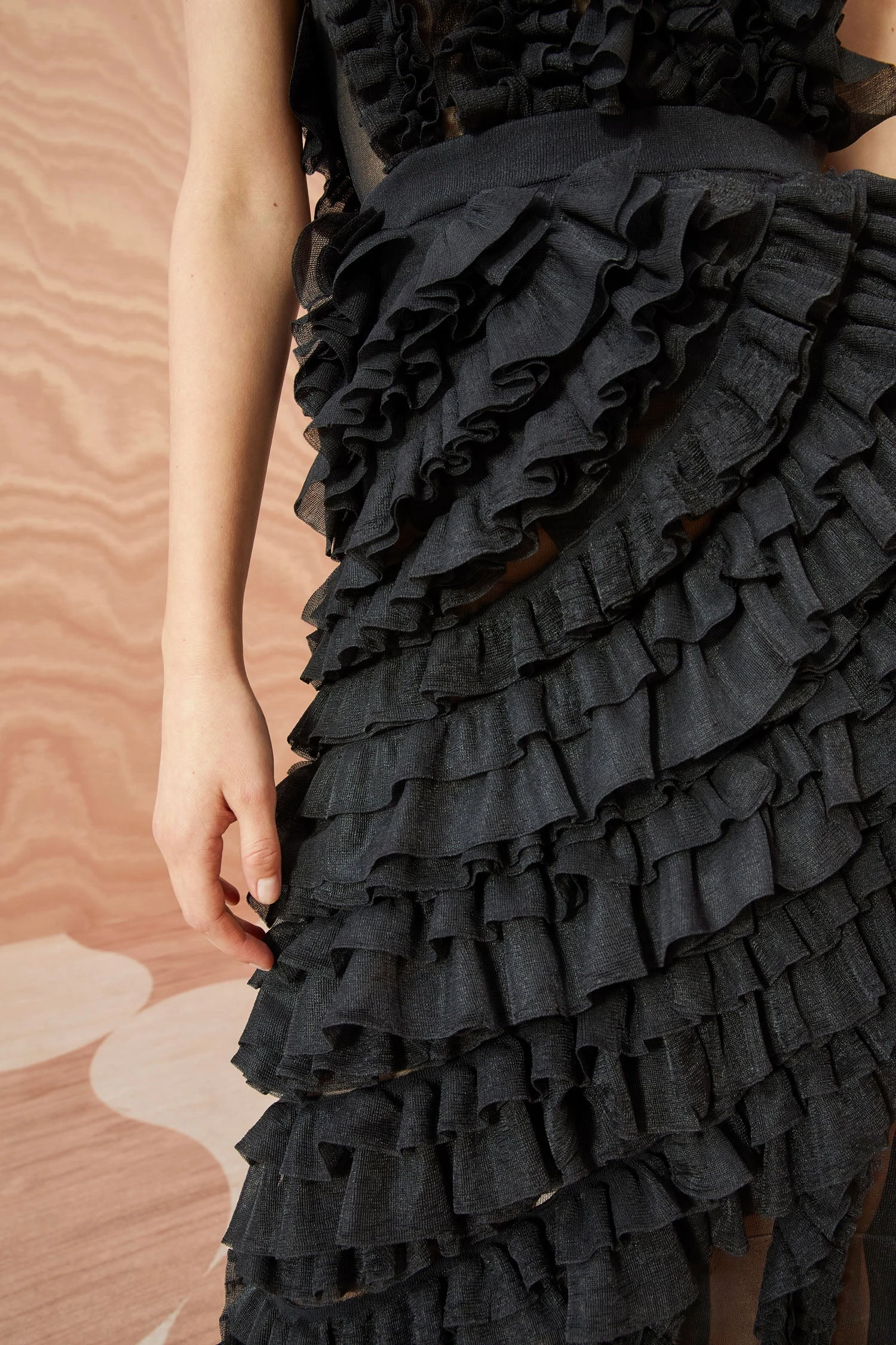 As featured in Look 17 of our Autumn/Winter ’23 Runway Show, the Sarafina Skirt is made from sheer black mesh adorned with an explosion of fluttering frills across its length that move in an asymmetric pattern. This midi-length skirt has a side split for ease of movement and an elastic waistband.