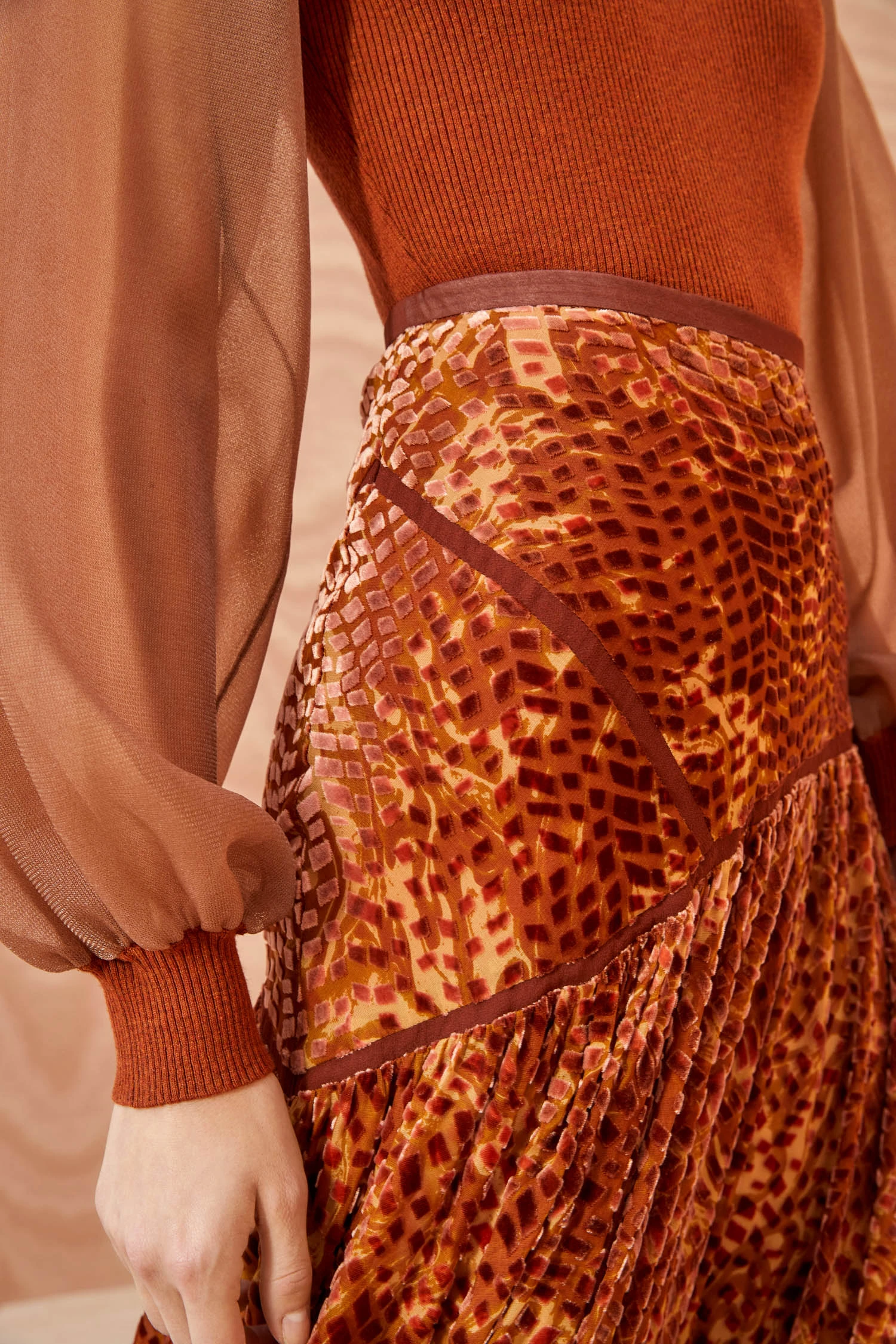 The Willa Skirt is a sienna brown beauty made from our luxurious velvet burnout that boasts a gently swirling moiré motif. This skirt unfurls to a beautiful maxi silhouette and is fully lined for coverage. It fastens with a hidden side-seam zipper.